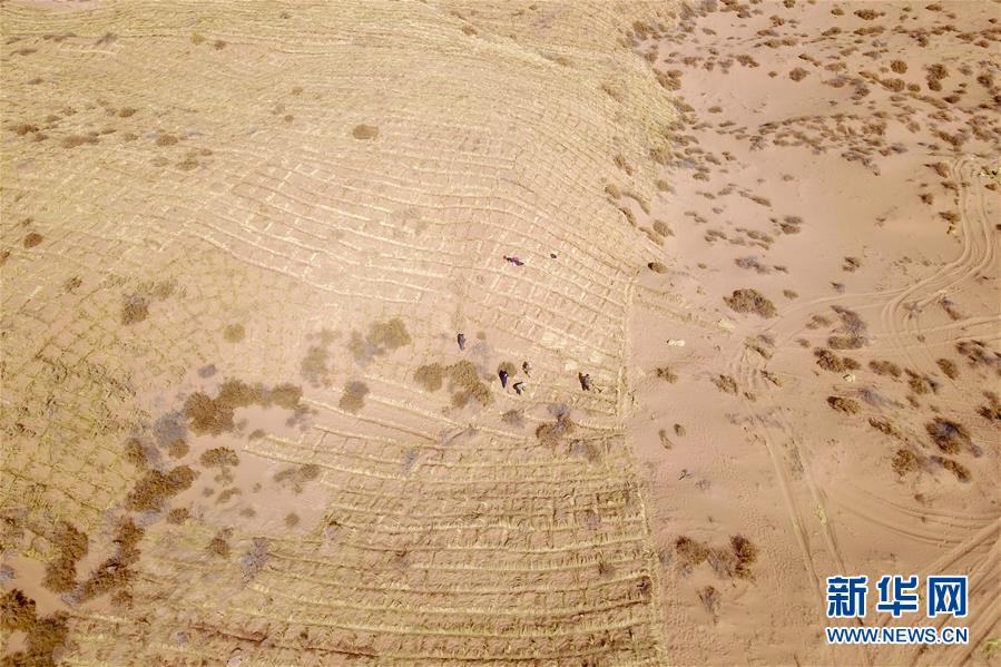 3月5日,在古浪縣北部沙區(qū)旱麻崗治沙點(diǎn),群眾扎草方格壓沙(無(wú)人機(jī)照片)。初春時(shí)節(jié),在騰格里沙漠南緣的甘肅省武威市古浪縣,當(dāng)?shù)馗刹柯毠ぜ鞍瞬缴沉謭?chǎng)治沙人共同在縣城北部沙區(qū)旱麻崗治沙點(diǎn)開(kāi)展春季治沙勞動(dòng)。新華社記者 范培珅 攝