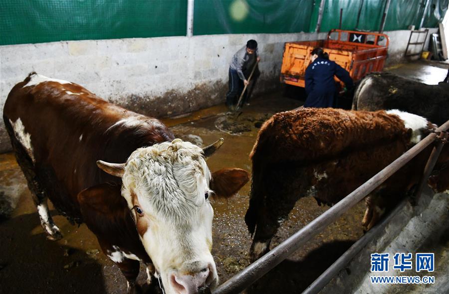 在貴州省銅仁市德江縣平原鎮(zhèn)坳田村,養(yǎng)殖戶(hù)在坳田畜牧養(yǎng)殖農(nóng)民專(zhuān)業(yè)合作社清理牛舍(2月29日攝)。新華社記者 楊文斌 攝