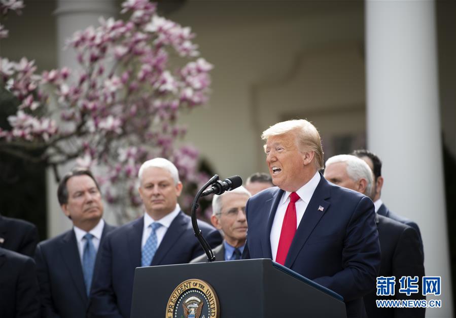 3月13日,美國(guó)總統(tǒng)特朗普(前)在華盛頓白宮的記者會(huì)上講話(huà)。特朗普當(dāng)天下午在白宮發(fā)表講話(huà)時(shí)正式宣布“國(guó)家緊急狀態(tài)”。他說(shuō),此舉旨在讓美國(guó)聯(lián)邦政府全力投入到抗擊新冠肺炎疫情的努力中。這項(xiàng)舉措將釋放500億美元資金,幫助各州和地方政府應(yīng)對(duì)疫情。新華社記者劉杰攝