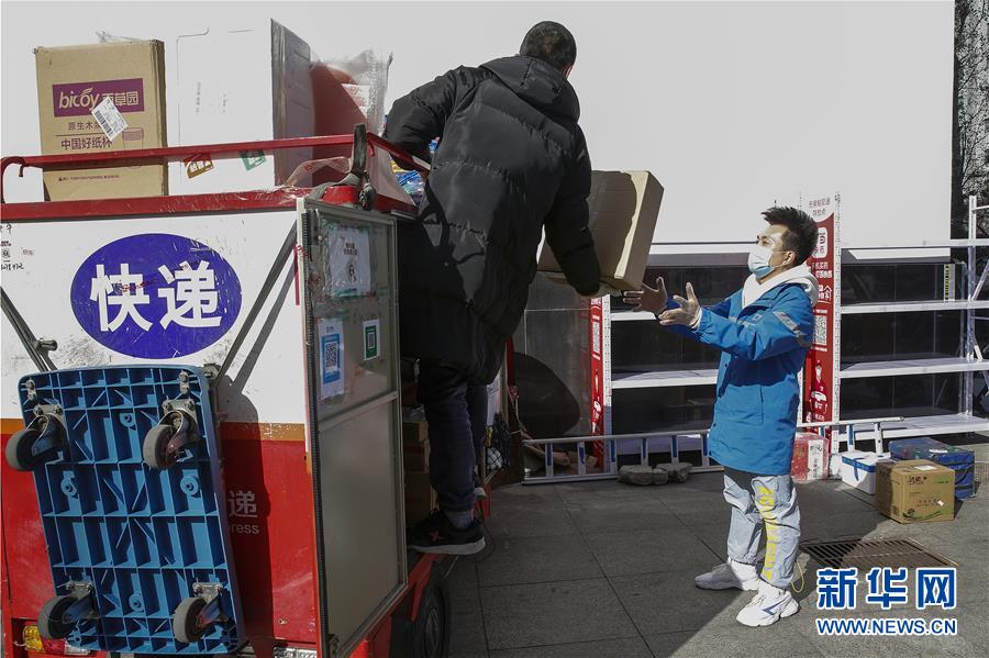 3月12日,李杰(右)在中國青年政治學院快遞點幫助其他公司同行卸貨。新華社記者張玉薇攝