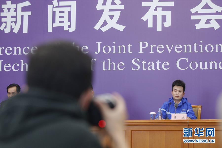 3月9日,中通快遞北京廠洼路網(wǎng)點快遞員李杰在北京出席國務院聯(lián)防聯(lián)控機制新聞發(fā)布會。新華社記者張玉薇攝