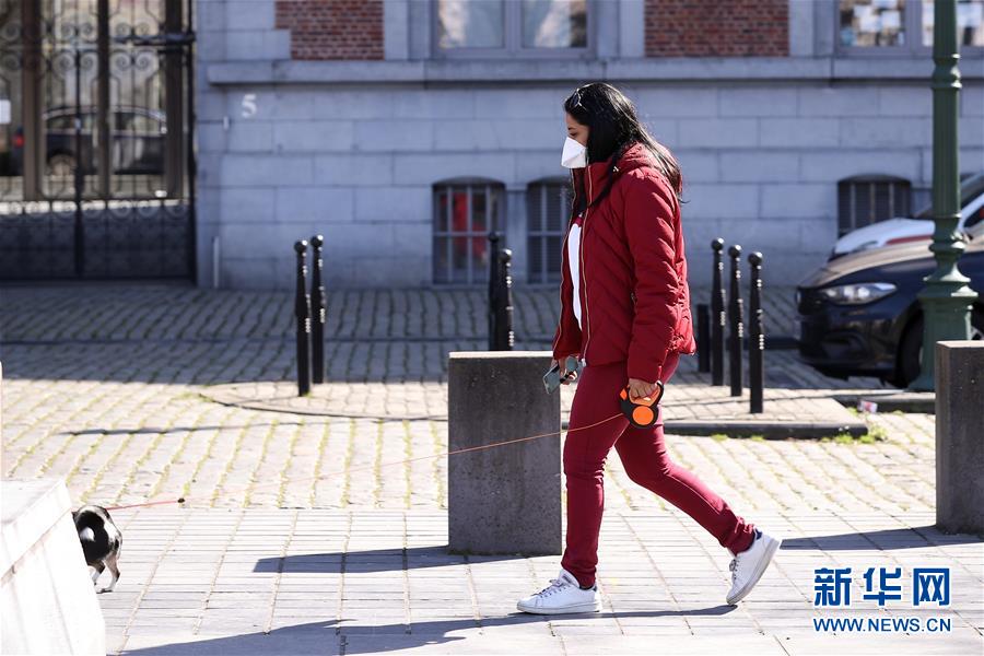 3月18日,在比利時布魯塞爾,一名佩戴口罩的女子在遛狗。 新華社記者 張鋮 攝