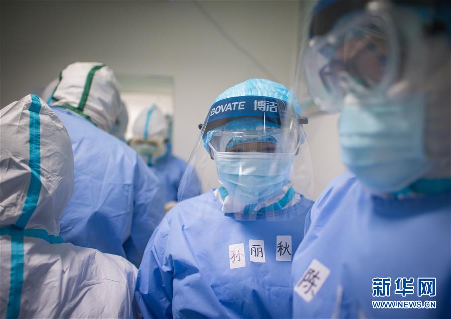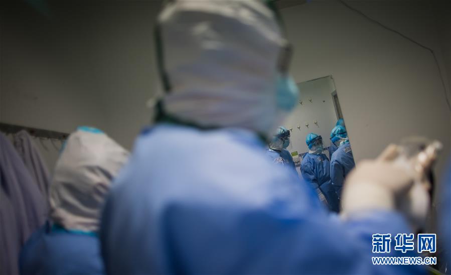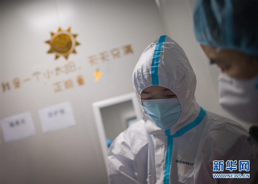 3月19日,在武漢市肺科醫(yī)院隔離病房,海南醫(yī)療隊隊員詹才露在現場忙碌。 新華社記者 肖藝九 攝