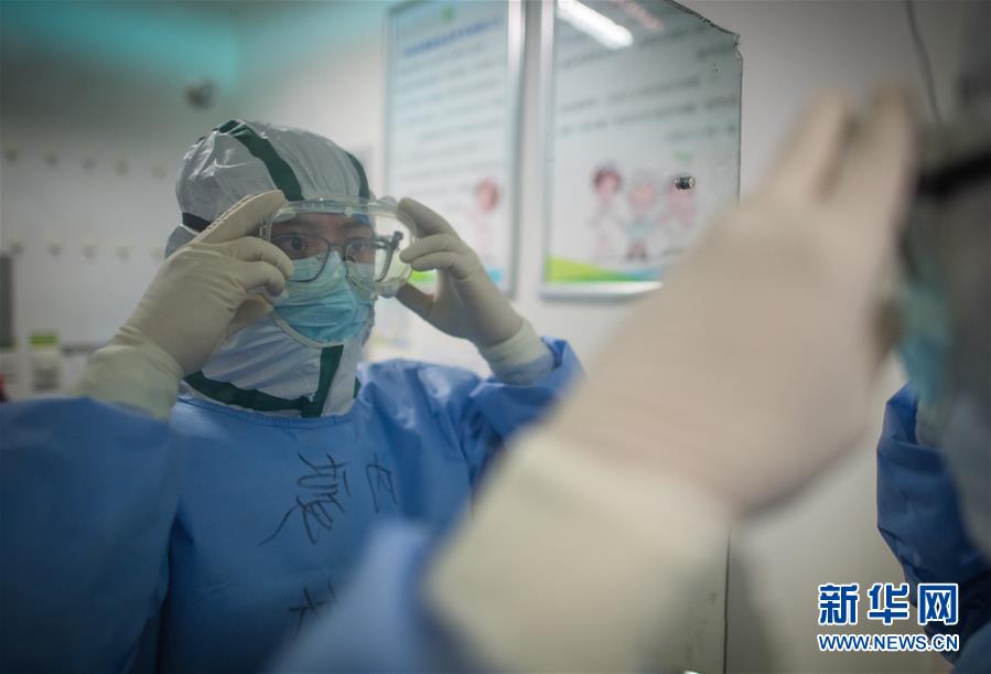 3月19日,在武漢市肺科醫(yī)院清潔區(qū),內蒙古醫(yī)療隊隊員在穿戴護目鏡。 新華社記者 肖藝九 攝