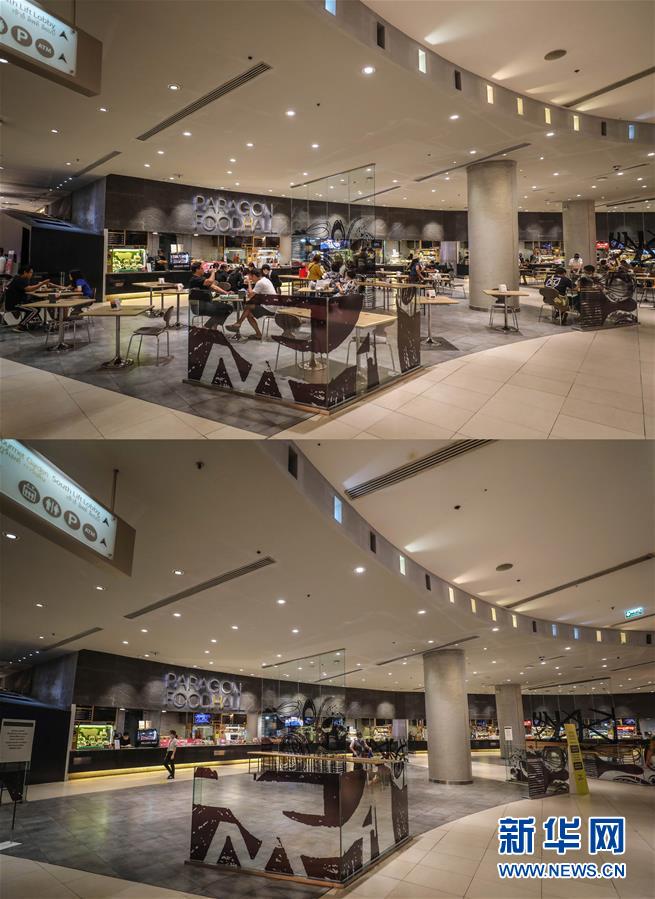 這是3月21日拍攝的泰國曼谷暹羅百麗宮商場負(fù)一層的美食城(上圖)和3月22日拍攝的美食城對比圖。商場除了負(fù)一層的美食城和超市外,全部關(guān)閉。美食城只對顧客提供外賣服務(wù)。新華社記者張可任攝