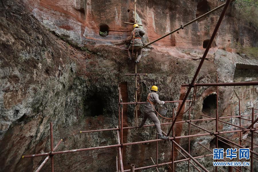 中鐵西北科學(xué)研究院有限公司文保中心的工作人員對大佛巖體進(jìn)行保護(hù)性清理(3月17日攝)。新華社記者江宏景攝
