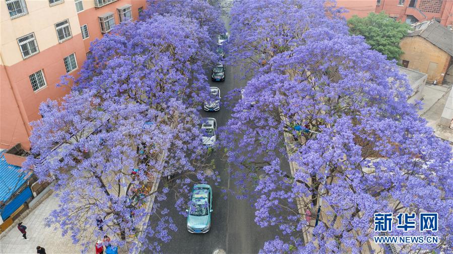 這是5月2日在昆明市教場(chǎng)中路拍攝的藍(lán)花楹(無(wú)人機(jī)照片)。近日,云南省昆明市部分街區(qū)的藍(lán)花楹競(jìng)相開(kāi)放,為春城增添靚麗風(fēng)景。新華社記者藺以光攝