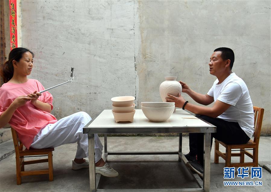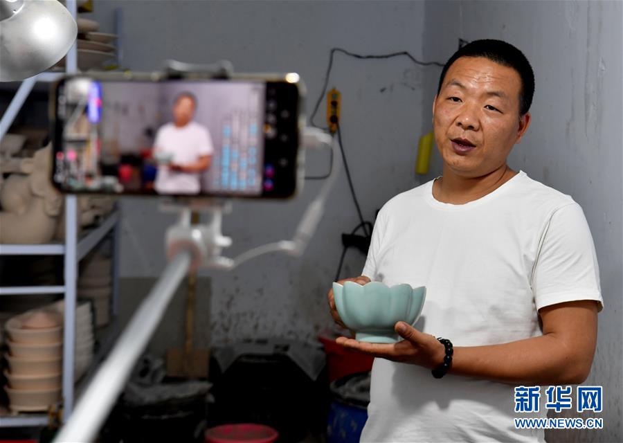 5月13日,寶豐縣大營鎮(zhèn)的汝瓷藝人王國奇在拍攝汝瓷產品短視頻。新華社記者李嘉南攝
