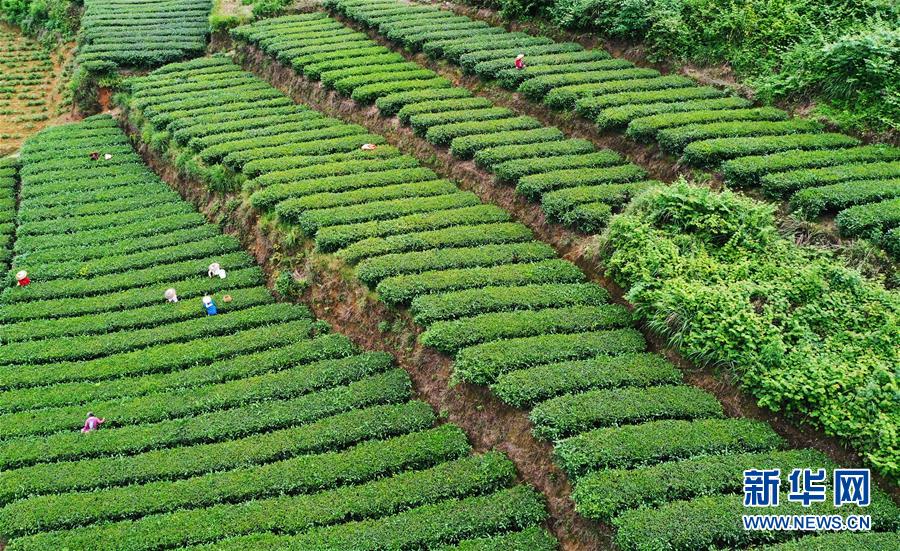 5月17日,村民在新院村茶葉基地采摘夏茶(無人機照片)。新華社記者王全超攝