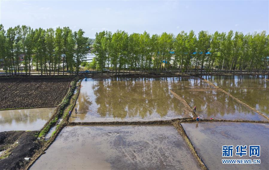 5月17日,在吉林省長(zhǎng)春市雙陽(yáng)區(qū)徐家村,農(nóng)民在水稻田間耕作(無(wú)人機(jī)照片)。新華社記者許暢攝