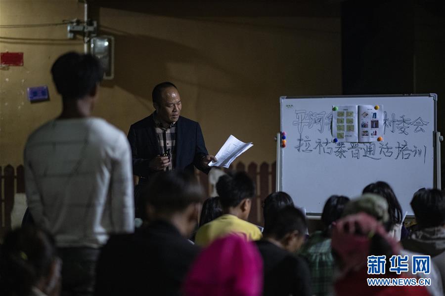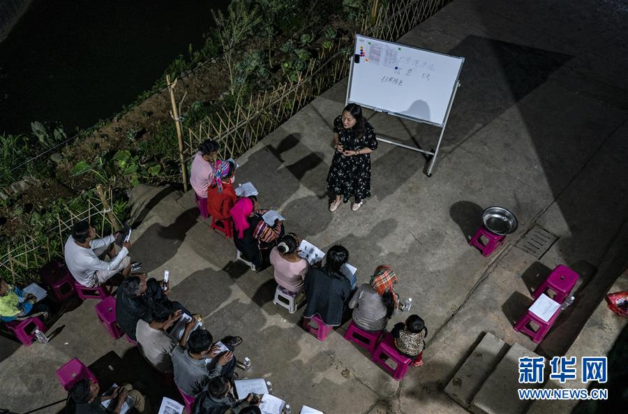 村民們利用夜間空閑時間,在院子里集體學習普通話(3月28日攝)。新華社記者江文耀攝