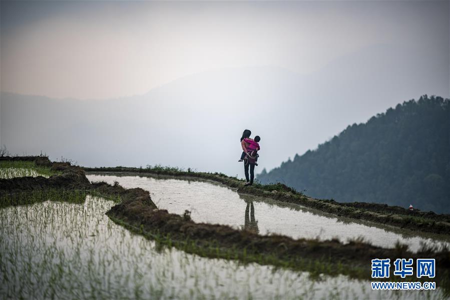 一名婦女背著孩子準備去田里勞作(3月26日攝)。新華社記者江文耀攝