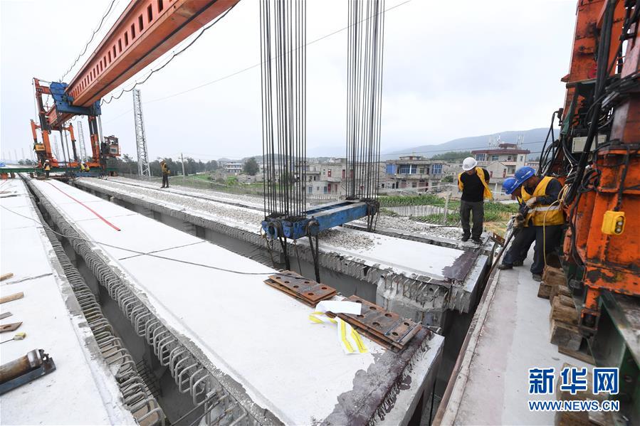 5月20日,中鐵二十四局工人在福平鐵路洋中特大橋架設(shè)T型梁。