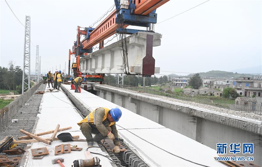 5月20日,福平鐵路洋中特大橋最后一片T型梁在架設(shè)中。新華社記者林善傳攝