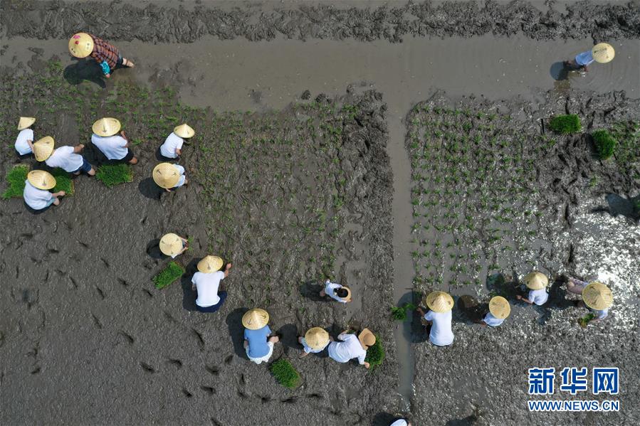 5月24日,小朋友與家長(zhǎng)在稻田里參加親子插秧比賽(無人機(jī)照片)。當(dāng)日,十余名小朋友在家長(zhǎng)的帶領(lǐng)下來到浙江省湖州市吳興區(qū)八里店鎮(zhèn)尹家圩糧油植保農(nóng)機(jī)專業(yè)合作社的稻田中,參加親子插秧、稻田捉魚等農(nóng)事體驗(yàn)活動(dòng)。新華社記者黃宗治攝