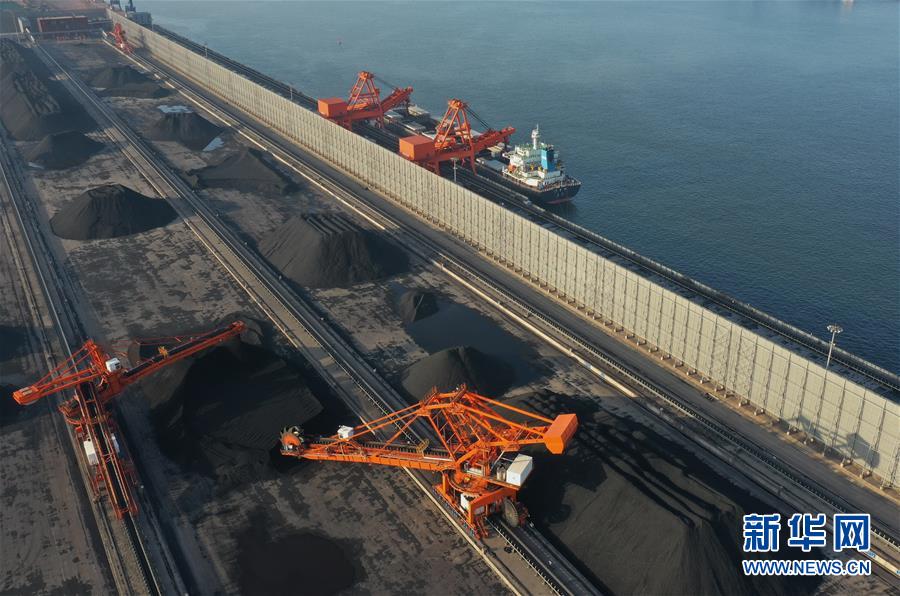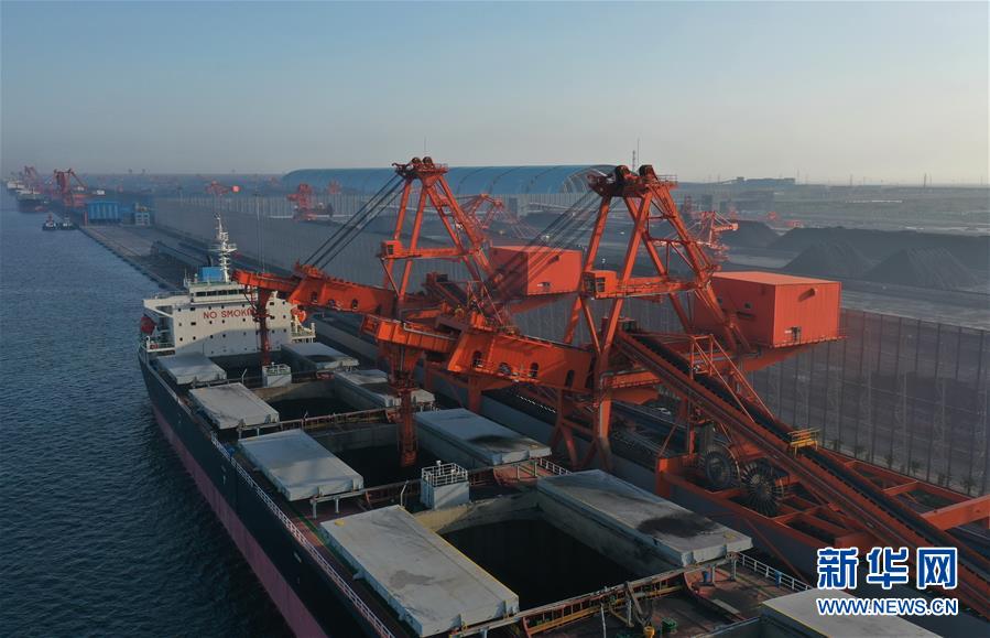 5月22日,一艘輪船靠泊在唐山港曹妃甸港區(qū)煤碼頭三期工程的先期工程泊位裝貨(無人機(jī)照片)。新華社記者楊世堯攝