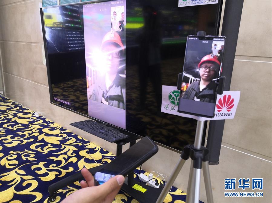 在山西陽煤集團新元煤礦調(diào)度中心,記者通過5G網(wǎng)絡(luò)視頻采訪井下礦工(5月27日手機拍攝)。新華社記者梁曉飛攝