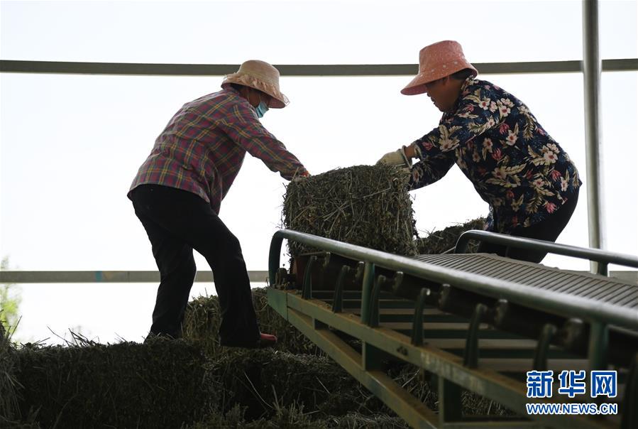 在平頂山市葉縣常村鎮(zhèn)月臺村扶貧車間倉庫,村民整理打好捆的艾草(5月27日攝)。