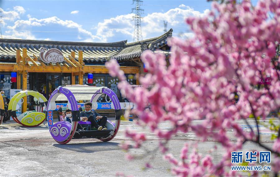 在延邊朝鮮族自治州和龍市“金達萊”民俗村,村民在村內(nèi)的咖啡館前體驗親子游樂項目(5月6日攝)。新華社記者許暢攝。
