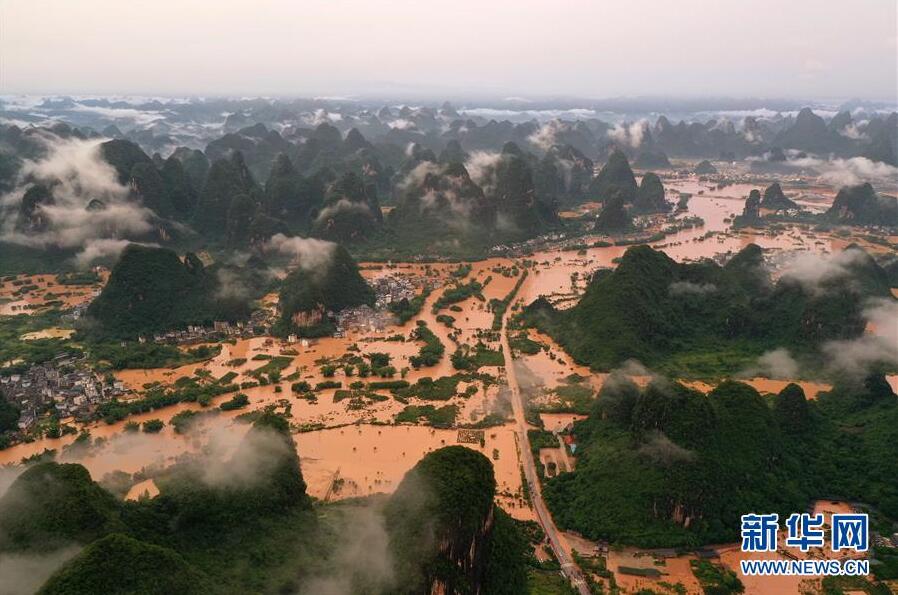 這是廣西陽朔縣部分出現(xiàn)嚴(yán)重積水的村莊(6月7日攝,無人機(jī)照片)。