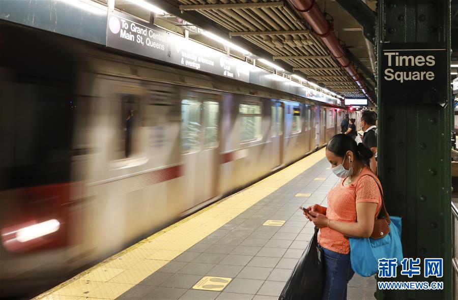 6月8日,佩戴口罩的乘客在美國(guó)紐約一地鐵站內(nèi)等車,地面上安置了保持社交距離的標(biāo)記。在因新冠疫情進(jìn)入“居家令”近三個(gè)月之后,美國(guó)紐約市于當(dāng)?shù)貢r(shí)間8日開始“解封”,進(jìn)入經(jīng)濟(jì)重啟的第一階段。新華社記者王迎攝