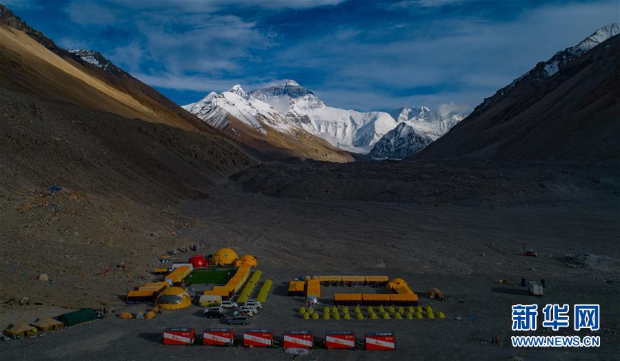 這是海拔5200米的珠峰登山大本營(無人機照片,5月25日攝)。從空中俯瞰珠穆朗瑪峰北坡,生機勃勃的高原濕地、蜿蜒曲折的盤山公路、壯麗秀美的絨布冰川,還有安靜的村莊和熱鬧的登山營地,共同構(gòu)成一幅壯美畫卷。新華社記者普布扎西攝