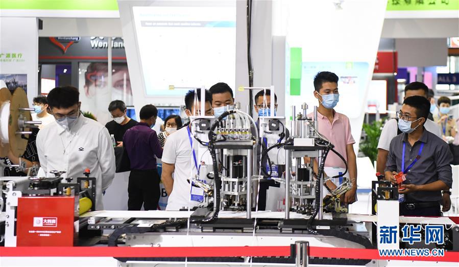 6月10日,觀眾參觀展會上的一臺口罩生產(chǎn)設(shè)備。當(dāng)日,廣州國際防疫物資展覽會在保利世貿(mào)博覽館舉行。本次展會面積共計3.6萬平方米,設(shè)有防疫產(chǎn)品、設(shè)備、綜合服務(wù)、原輔料等4個展區(qū),參展企業(yè)約600家。新華社記者鄧華攝