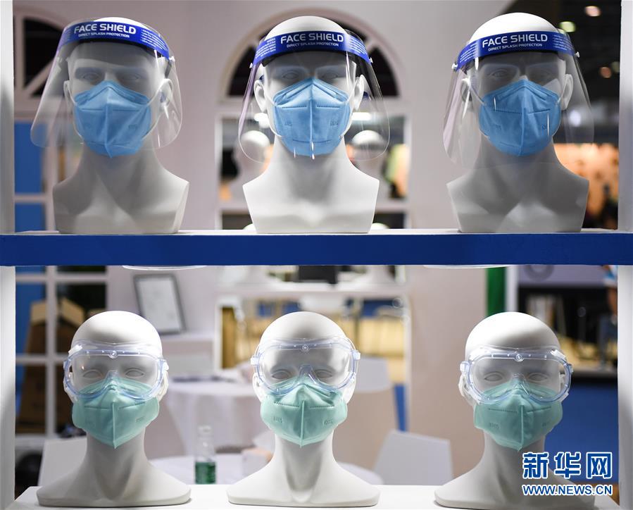 6月10日拍攝的展會上的口罩和防護罩產品。當日,廣州國際防疫物資展覽會在保利世貿博覽館舉行。本次展會面積共計3.6萬平方米,設有防疫產品、設備、綜合服務、原輔料等4個展區(qū),參展企業(yè)約600家。新華社記者鄧華攝