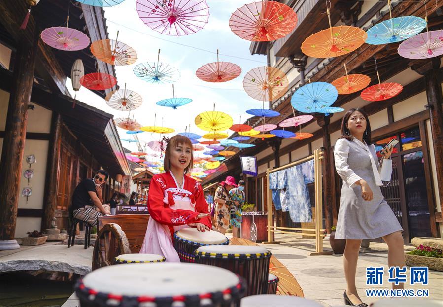 6月13日,在長春市世茂蓮花山小鎮(zhèn)寬厚里商街,一名古裝愛好者演奏手鼓。當日是“文化和自然遺產(chǎn)日”。吉林長春首屆蓮花山消夏生活節(jié)在世茂蓮花山小鎮(zhèn)舉行?;顒訉⒎沁z展示與假日消暑休閑相結(jié)合,讓游人在“古色古香”的油紙傘巷中品傳統(tǒng)文化魅力,享夏日休閑愜意。新華社記者 許暢 攝