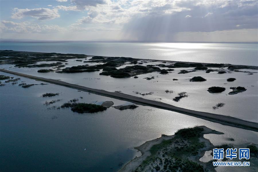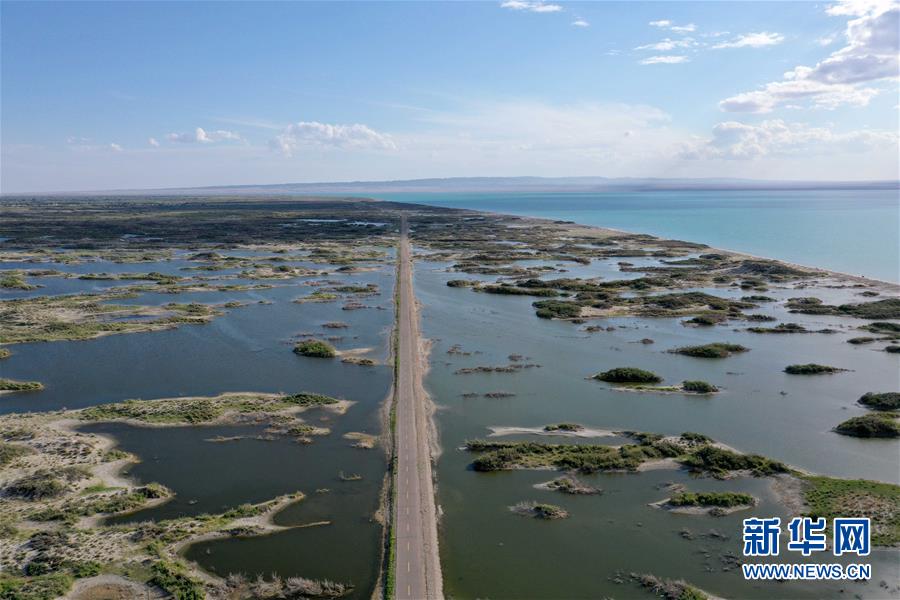 6月19日拍攝的新疆烏倫古湖國家濕地公園(無人機(jī)照片)。烏倫古湖國家濕地公園位于新疆阿勒泰地區(qū)福海縣城以西,由烏倫古湖和吉力湖兩部分組成。烏倫古湖濕地公園是遷徙候鳥飛越天山和阿爾泰山的“能量補(bǔ)充站”,良好的濕地生態(tài)吸引著大量遷徙鳥類在此集結(jié)成群,繁殖棲息,成為一道靚麗的風(fēng)景線。新華社記者 沙達(dá)提 攝