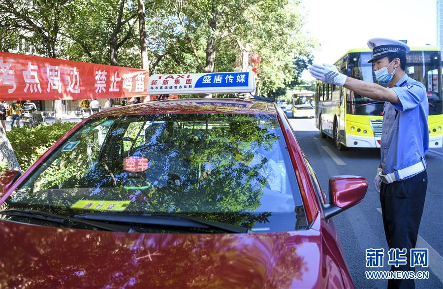 6月20日,在烏魯木齊市第十一中學(xué)門前,烏魯木齊市公安局交警支隊(duì)天山區(qū)大隊(duì)新華路中隊(duì)警官肖健波提醒過往車輛減速慢行、禁止鳴笛。當(dāng)日,烏魯木齊市初中升高中考試開始。為保障為期三天的中考順利進(jìn)行,烏魯木齊市公安局交警支隊(duì)在各考點(diǎn)執(zhí)勤,為考生保駕護(hù)航新華社記者 王菲 攝