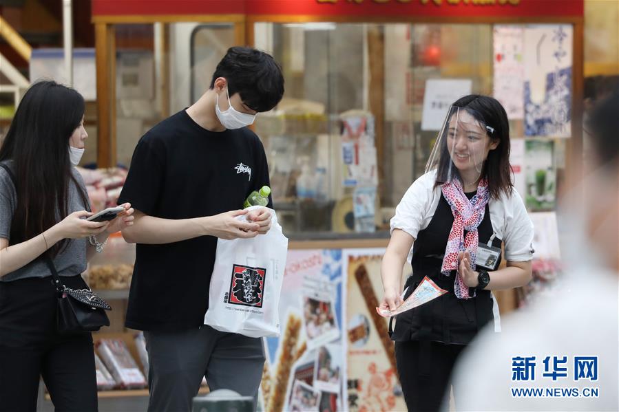 6月21日,在日本東京,一名人力車工作人員(右)向游客發(fā)傳單。當(dāng)日是周末,日本政府繼解除全國各地緊急狀態(tài)之后,19日起解除避免跨縣移動(dòng)的要求,全國范圍內(nèi)允許自由移動(dòng),進(jìn)一步松綁社會(huì)經(jīng)濟(jì)活動(dòng)。東京一些觀光景區(qū)內(nèi)的店鋪逐漸恢復(fù)營業(yè),人流量有所回升。新華社記者杜瀟逸攝