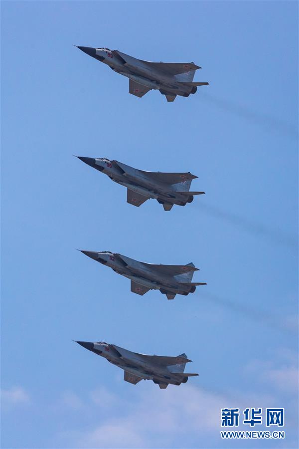 6月20日,在俄羅斯首都莫斯科,米格-31K戰(zhàn)斗機(jī)編隊參加閱兵式彩排。俄羅斯將于6月24日舉行紀(jì)念衛(wèi)國戰(zhàn)爭勝利75周年閱兵式。新華社記者白雪騏攝
