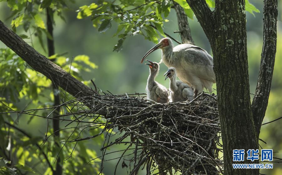 在陜西省漢中市洋縣四郎鎮(zhèn)田嶺村的一片密林里,朱鹮在巢里照看幼鳥(2018年6月2日攝)。記者22日從陜西省林業(yè)局了解到,據(jù)不完全統(tǒng)計,曾幾近滅絕的朱鹮,其全球種群數(shù)量已超過5000只,其中中國境內(nèi)4400只,棲息地呈現(xiàn)出以秦嶺為中心向東亞歷史分布地擴(kuò)展的趨勢。新華社記者陶明攝