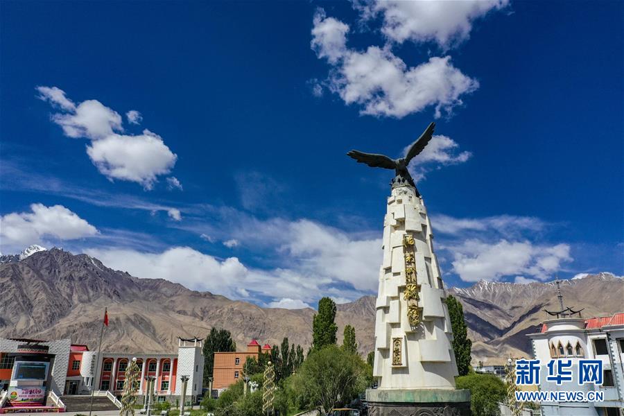 這是位于新疆塔什庫(kù)爾干塔吉克自治縣縣城的“帕米爾雄鷹”雕塑(6月20日攝,無人機(jī)照片)。新華社記者胡虎虎攝