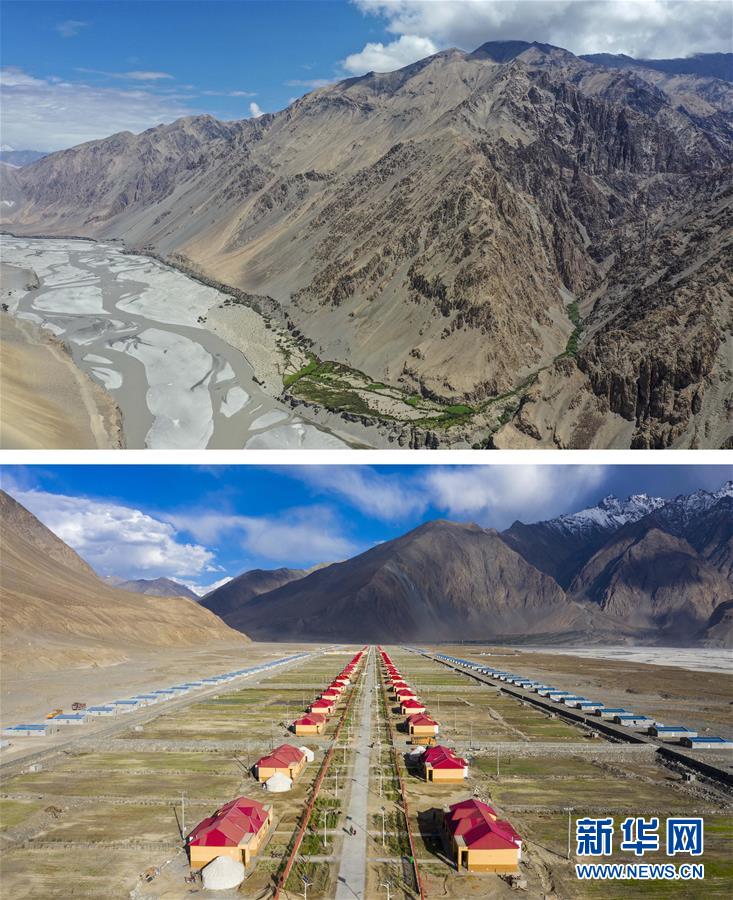 拼版照片:上圖為新疆塔什庫爾干塔吉克自治縣熱斯喀木村易地扶貧搬遷前一處散居的居住點(diǎn)(2019年7月8日攝,無人機(jī)照片);下圖為實(shí)施易地扶貧搬遷后的熱斯喀木村新貌(6月6日攝,無人機(jī)照片)。新華社記者胡虎虎攝