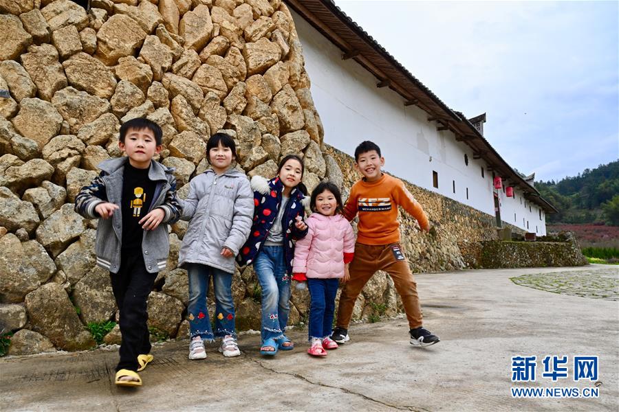 名兒童在福建省永泰縣同安鎮(zhèn)傳統(tǒng)莊寨建筑愛(ài)荊莊前玩耍(3月19日攝)。新華社記者姜克紅攝