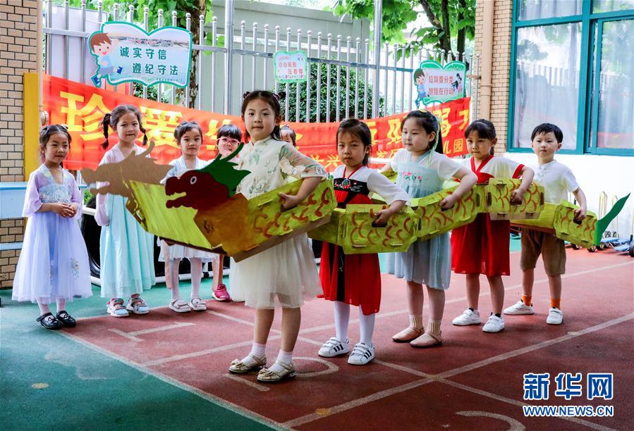 6月23日,長(zhǎng)興縣開(kāi)發(fā)區(qū)實(shí)驗(yàn)幼兒園的孩子們用廢舊的紙箱做成“龍舟”進(jìn)行表演。為了迎接即將到來(lái)的端午節(jié),浙江省湖州市長(zhǎng)興縣各個(gè)幼兒園開(kāi)展“品民俗迎端午”主題活動(dòng),讓小朋友們體驗(yàn)傳統(tǒng)民俗文化。新華社記者徐昱攝