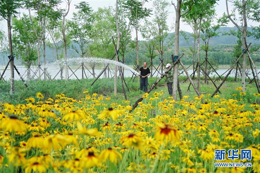 6月27日,園林工人在遷西縣長河帶狀公園給綠地澆水。新華社記者牟宇攝