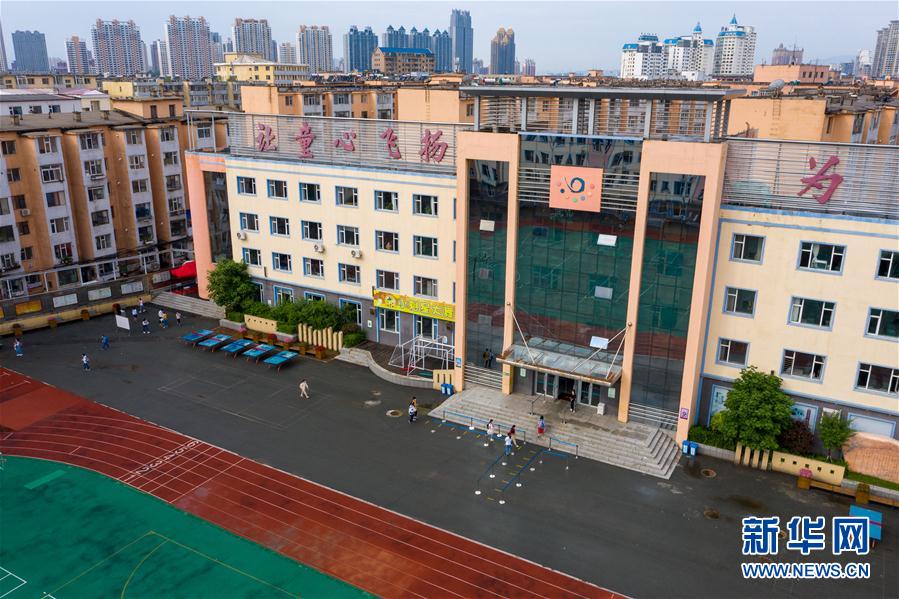 6月29日,在吉林市第一實驗小學(xué),學(xué)生陸續(xù)進入教學(xué)樓(無人機照片)。新華社記者張楠攝