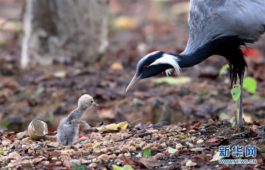 成年蓑羽鶴在照顧剛剛破殼的小鶴(6月23日攝)。新華社發(fā)(余會(huì)功攝)
