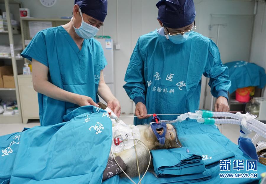 6月29日,研究人員在病房內(nèi)查看移植肝受體猴。日前,多基因編輯豬-恒河猴異種肝、心、腎器官移植在位于陜西西安的空軍軍醫(yī)大學西京醫(yī)院順利實施。研究團隊使用豬內(nèi)源性逆轉錄病毒(PERV)敲除的13個基因修飾豬作為供體,將一個供體豬的肝、心、腎分別移植給3只恒河猴受體。目前,移植肝和對應的受體猴已存活16天,突破國際上的豬-猴輔助性肝移植最長存活時間記錄。這項研究有助于未來解決器官短缺造成的臨床器官移植發(fā)展受限難題。新華社記者邵瑞攝