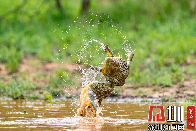 2020年6月30日報道(具體拍攝時間不詳),南非波羅克瓦克,兩只雄性非洲牛蛙為了爭奪雌性牛蛙,在池塘中打架,這樣的情形十分罕見。畫面中,戰(zhàn)況十分激烈,一只非洲牛蛙在另外一只試圖逃到池塘邊緣時撕咬對手,甚至將另外一只拋向空中。這些精彩的照片是由南非開普敦攝影師Temujin Johnson拍攝的。