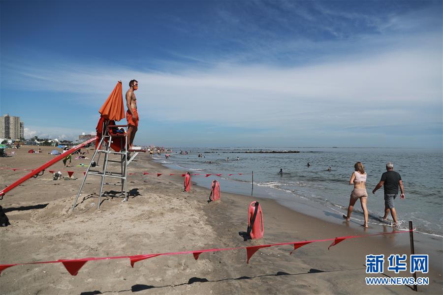 7月1日,救生員在美國紐約科尼島的一處海灘查看海面情況。當日,美國紐約市屬八處海灘正式重新準許民眾游泳,救生員也同時上崗。新華社記者王迎攝