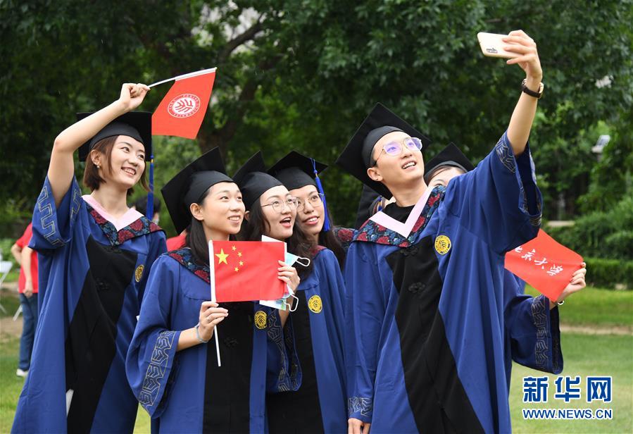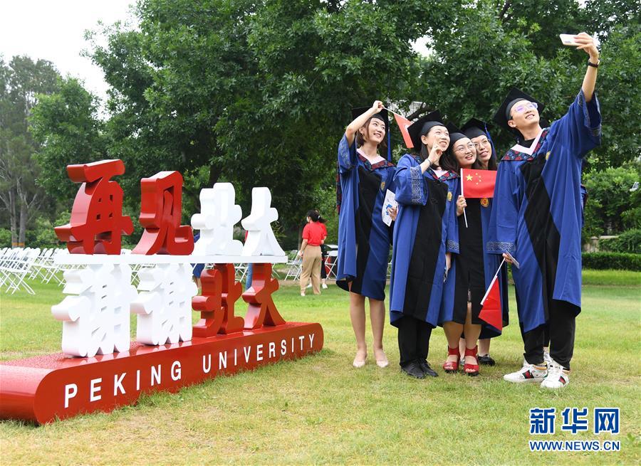 7月2日,北京大學(xué)2020屆畢業(yè)生在畢業(yè)典禮結(jié)束后拍照留念。當(dāng)日,北京大學(xué)舉行2020年畢業(yè)典禮。由于疫情防控需要,今年的典禮在北京大學(xué)辦公樓西側(cè)廣場、靜園草坪、未名湖等九個會場舉行,并面向全球進(jìn)行中英文雙語直播,僅部分在校畢業(yè)生現(xiàn)場參加,更多畢業(yè)生通過線上直播參與畢業(yè)典禮。新華社記者任超攝