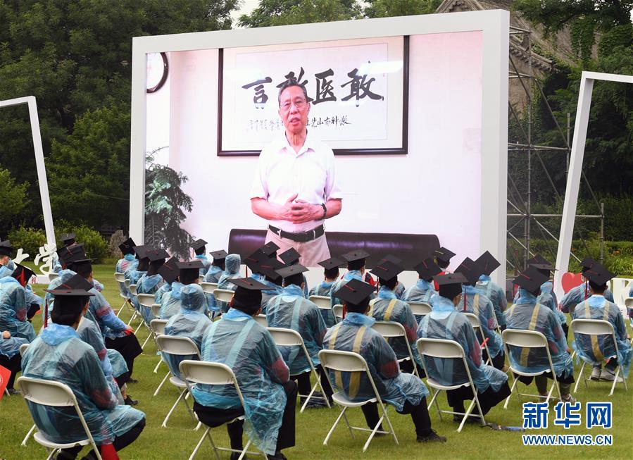 7月2日,2020屆畢業(yè)生在畢業(yè)典禮上觀看校友代表、國家呼吸系統(tǒng)疾病臨床醫(yī)學(xué)研究中心主任鐘南山發(fā)言視頻。當(dāng)日,北京大學(xué)舉行2020年畢業(yè)典禮。由于疫情防控需要,今年的典禮在北京大學(xué)辦公樓西側(cè)廣場、靜園草坪、未名湖等九個會場舉行,并面向全球進(jìn)行中英文雙語直播,僅部分在校畢業(yè)生現(xiàn)場參加,更多畢業(yè)生通過線上直播參與畢業(yè)典禮。新華社記者任超攝