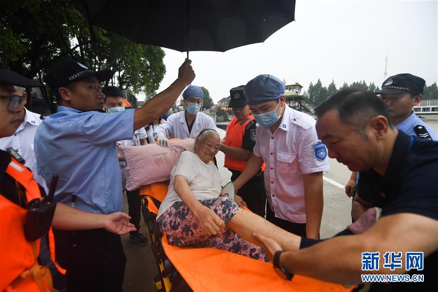 7月8日,應(yīng)急人員將東洲街道五豐島97歲癱瘓?jiān)诖驳亩咸冯x出來(lái),安全轉(zhuǎn)移到岸上。新華社記者徐昱攝