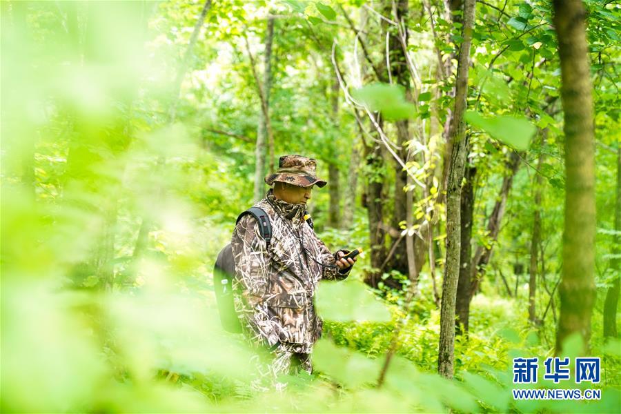 董紅雨在迎春林業(yè)局有限公司施業(yè)區(qū)內進行野生東北虎信息搜集和巡護工作(7月8日攝)。新華社記者馬曉成攝