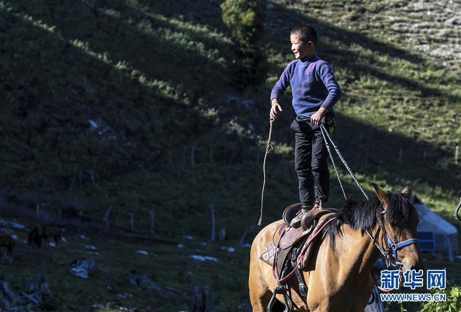 在新疆特克斯縣境內的夏牧場里,一名小朋友站在馬背上玩耍(6月30日攝)。新華社記者王菲攝