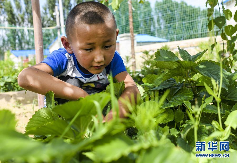 在新疆特克斯縣境內的牧民定居點,一名小朋友幫家人采摘自家種植的水果(7月6日攝)。新華社記者王菲攝